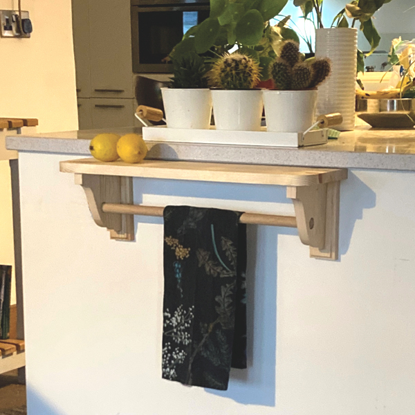 Cotswold style wooden shelf and towel rail, finishing touch to any kitchen/utility, bathroom or bootroom.With hidden fixings for a modern cottage lookComes ready to finish with your choosen stain, varnish or PaintSize2x Pine bracket, size 20cm tall x 14cm15cm deep Pine Shelf upto 1m longOak rail